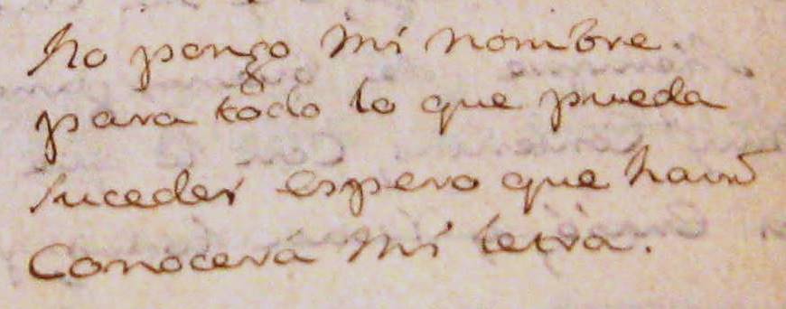 Mi querida madre, el gusto de aver tenido noticia de ella y toda la querida comunidat es muy grande, y está escrito en mi corazón para siempre, y todos de su nación para mi gran trabajo de no poderles ayudar y poner todos en mejor estado. Por manos de Perlas vendrá, muy amada madre, un pequenyo socorro, y avísenme quando lo tienen recibido, y si es posible darme de sus noticias alguna vez, que padece tanto siento mucho, Dios quiera azerla más perfeta y mira que santa ya es de muchos anyos. Yo lo paso bien, gracias a Dios, sin cruz esta vida no es, y Cristo es que me ensenya a traerla, que así se puede aguantar. Mis muchachas están buenas, pero les falta hermano que la divina bondat haún no me quiere dar. Nos encomendamos todos a sus santas oraciones y creen me siempre, en particular muy querida madre Theresa, muy suya, a 25 diciembre 1724. No pongo mi nombre para todo lo que pueda suceder, espero que haún conocerá mi letra.