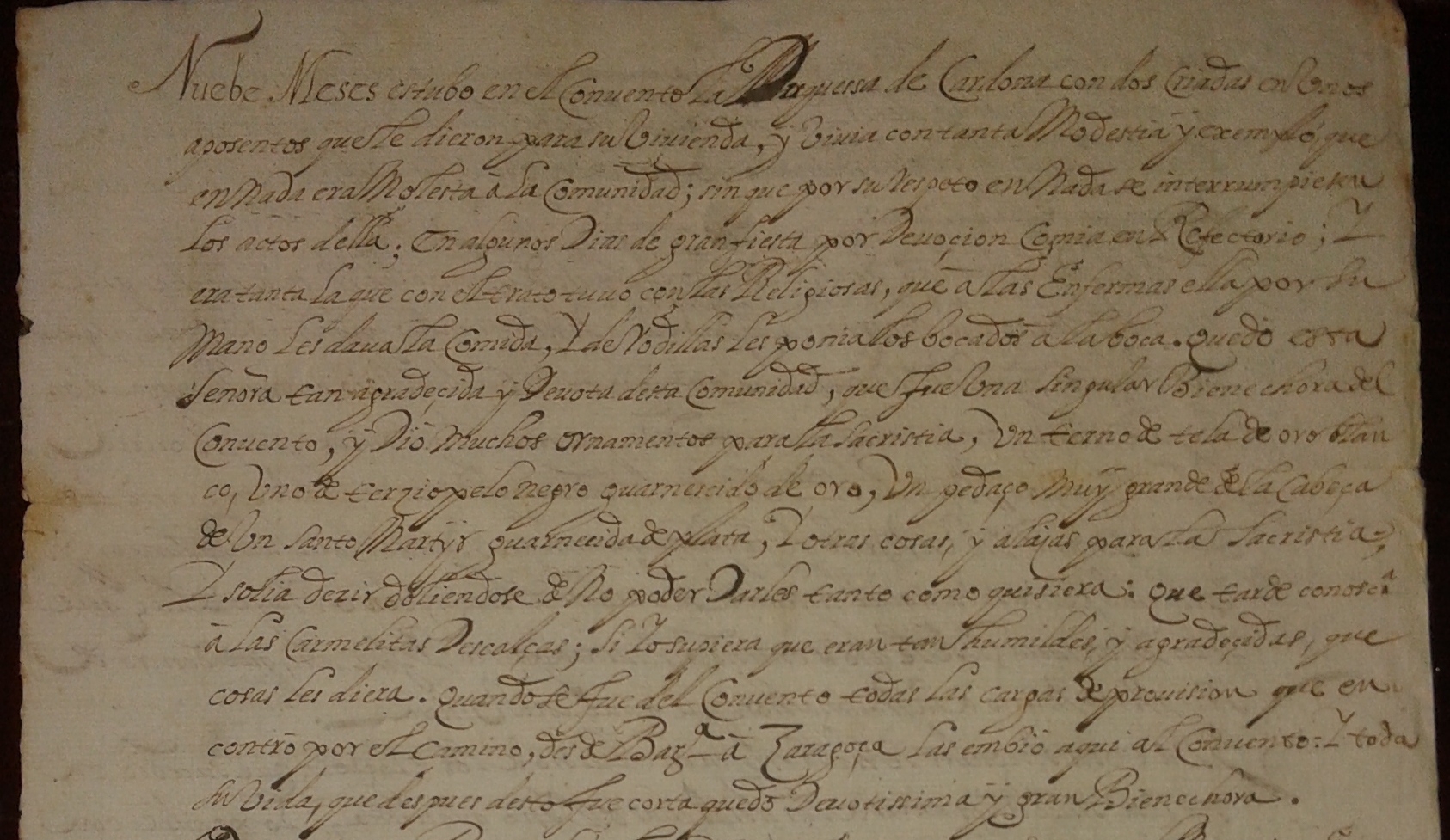 Nuebe meses estubo en el convento la duquessa de Cardona con dos criadas en unos aposentos que le dieron para su vivienda, y vivía con tanta modestia y exemplo que en nada era molesta a la comunidad, sin que por su respeto en nada se interrumpiesen los actos d’ella; en algunos días de gran fiesta por devoçión comía en refectorio; y era tanta la que con el trato tuvo con las religiosas que a las enfermas ella por su mano les dava la comida, y de rodillas les ponía los bocados a la boca. Quedó esta señora tan agradeçida y devota d’esta comunidad que fue una singular bienechora del convento y dio muchos ornamentos para la sacristía, un terno de tela de oro blanco, uno de terziopelo negro guarnescido de oro, un pedaço muy grande de la cabeça de un santo mártyr guarnecida de plata y otras cosas y alajas para la sacristía. Y solía dezir, doliéndose de no poder darles tanto como quisiera: “¡Qué tarde conoscí a las carmelitas descalças! Si yo supiera que eran tan humildes y agradeçidas, qué cosas les diera”. Quando se fue del convento todas las cargas de provisión que encontró por el camino, desde Barcelona a Zaragoça, las embió aquí al convento. Y toda su vida, que después d’esto fue corta, quedó devotíssima y gran bienechora.