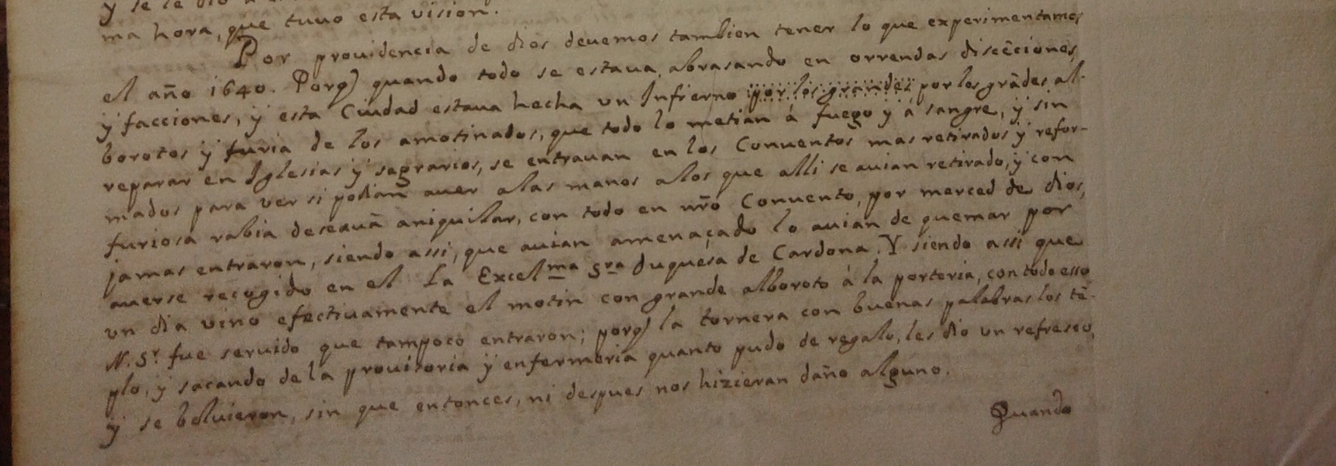 Por providencia de Dios devemos también tener lo que experimentamos el año 1640. Porque quando todo se estava abrasando en orrendas discenciones y facciones, y esta ciudad estava hecha un infierno por los grandes alborotos y furia de los amotinados, que todo lo metían a fuego y a sangre, y, sin reparar en iglesias y sagrarios, se entravan en los conventos más retirados y reformados para ver si podían aver a las manos a los que allí se avían retirado y con furiosa rabia deseavan aniquilar; con todo, en nuestro convento, por merced de Dios, jamás entraron, siendo assí que avían amenaçado lo avían de quemar por averse recogido en él la excelentísima señora duquesa de Cardona. Y siendo assí que un día vino efectivamente el motín con grande alboroto a la portería, con todo esso Nuestro Señor fue servido que tampoco entraron, porque la tornera, con buenas palabras los templó. Y, sacando de la provisoría y enfermería quanto pudo de regalo, les dio un refresco y se bolvieron, sin que entonces ni después nos hizieran daño alguno.