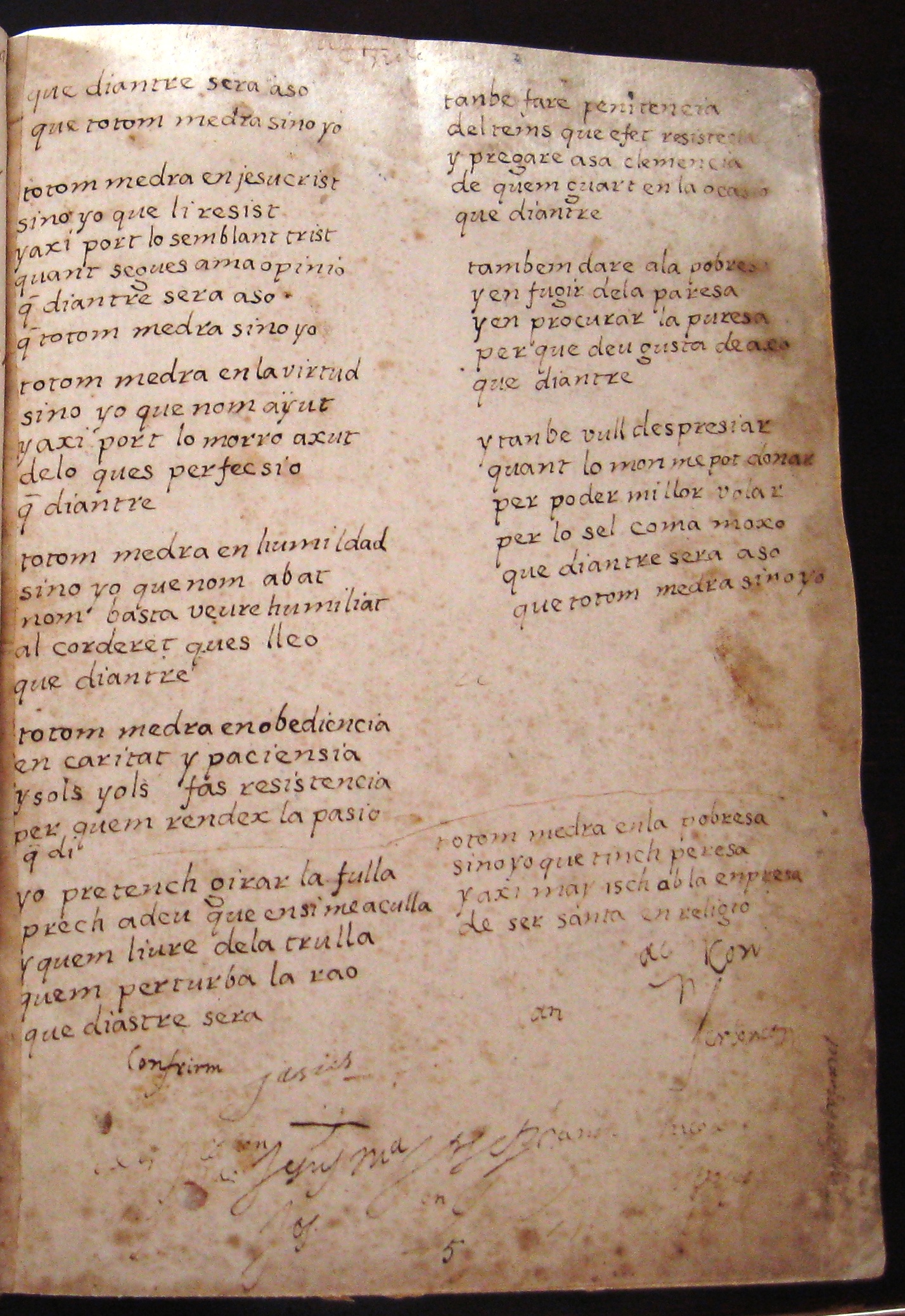 Ara bé, mentre que en altres cançoners carmelitans (per ex. el de Valladolid), els cicles o sèries temàtiques se succeeixen en grups o blocs de composicions més o menys compactes, el criteri de disposició de les composicions del cançoner barceloní ve condicionat per la copista del moment i, en algunes ocasions, hi trobem peces intercalades molt heterogènies. De les lletres que copien el manuscrit, en destaca especialment una del segle XVII, que, segons hem pogut esbrinar a través de la consulta del llibre de professions de la comunitat i altra documentació d’arxiu, pertany a Clara del Santíssim Sagrament, Granollacs Blanes (1591-1648) –neboda de Francesc de Granollacs, fundador del convent–, que va creuar una peça de “desafío” (intercanvis espirituals de peces) amb una altra religiosa de la comunitat, Teresa de Jesús, Meca de Vilana (1592-1636); la peça, juntament amb la resposta poètica rebuda de la ploma de la seva companya de professió, es troba copiada al manuscrit i és l’única que es pot afillar amb certesa.