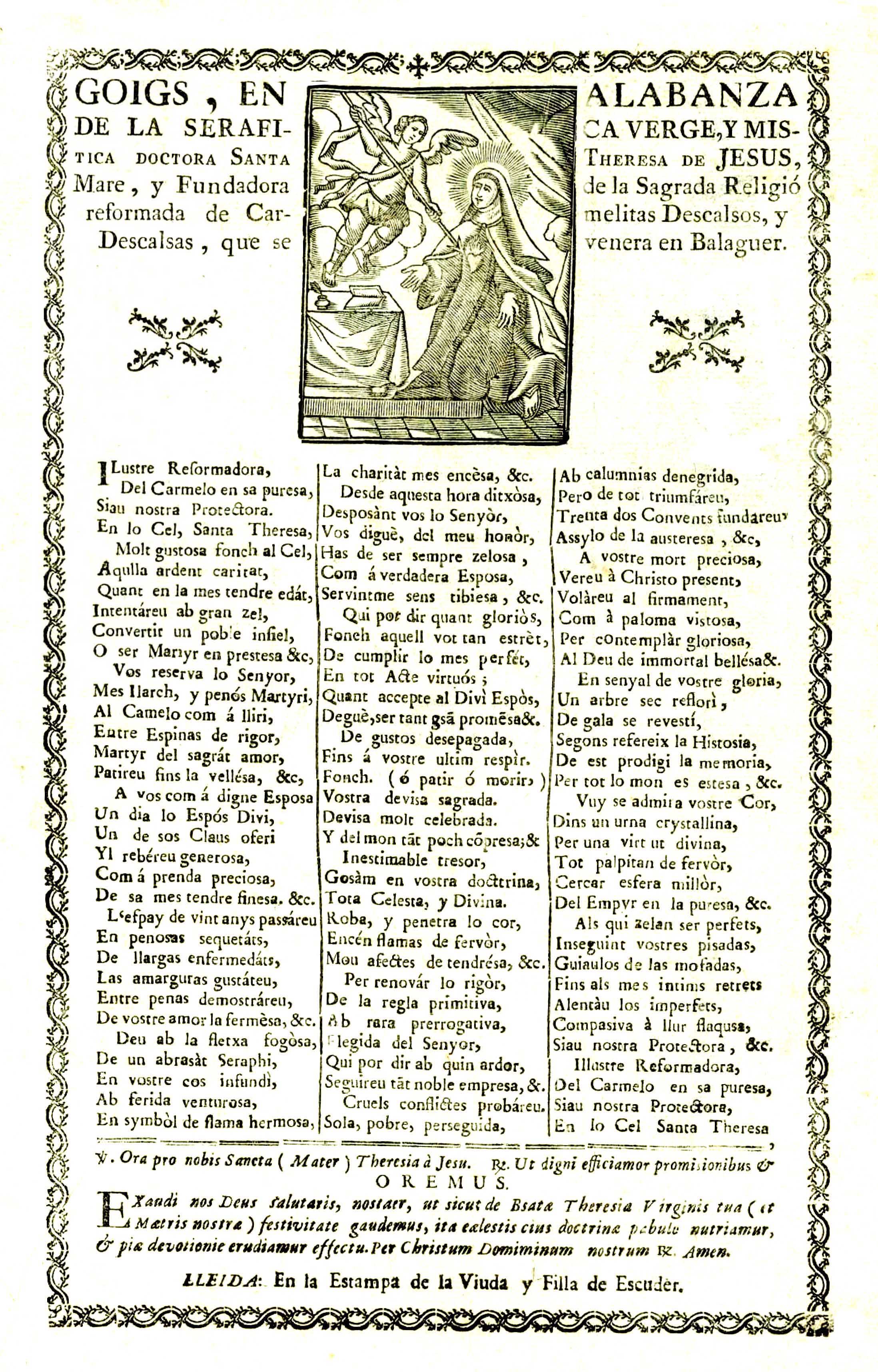 Goigs, en alabanza de la seràfica verge, y mística doctora Santa Theresa de Jesús, mare, y fundadora de la Sagrada Religió reformada de Carmelitas Descalsos, y Descalsas, que se venera en Balaguer, Lleida: En la Estampa de la Viuda y Filla de Escuder, c. 1790.