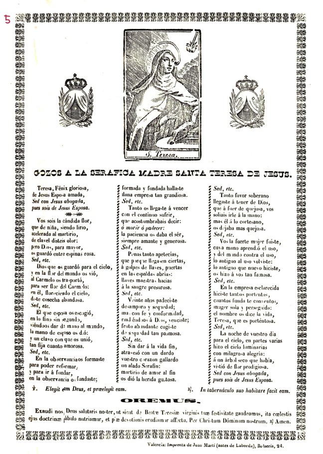 [4] Gozos a la serafica madre Santa Teresa de Jesus, Valencia: Imprenta de Laborda, s. a. ¶ [5] Gozos a la serafica madre Santa Teresa de Jesus, Valencia: Imprenta de Juan Martí (antes de Laborda), Bolseria, 24, s. a.
