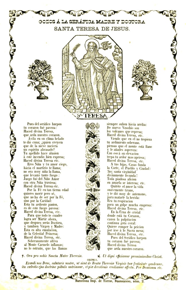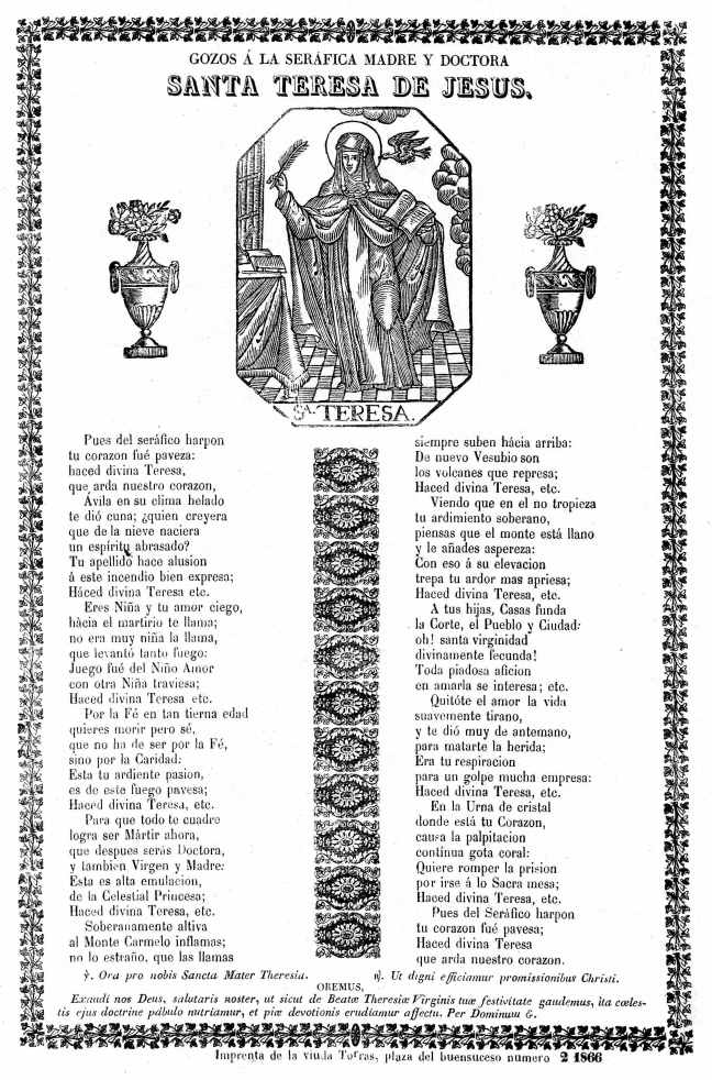 Gozos á la seráfica madre y doctora Santa Teresa de Jesús, Barcelona: Imp. De Torras, Buensuceso, núm. 2. ¶ Gozos á la seráfica madre y doctora Santa Teresa de Jesús, [Barcelona]: Imprenta de la viuda Torras, plaza Buensuceso numero 2, 1866. Dins de la xilografia amb la imatge de la santa hi figura la inscripció “Sª TERESA”.