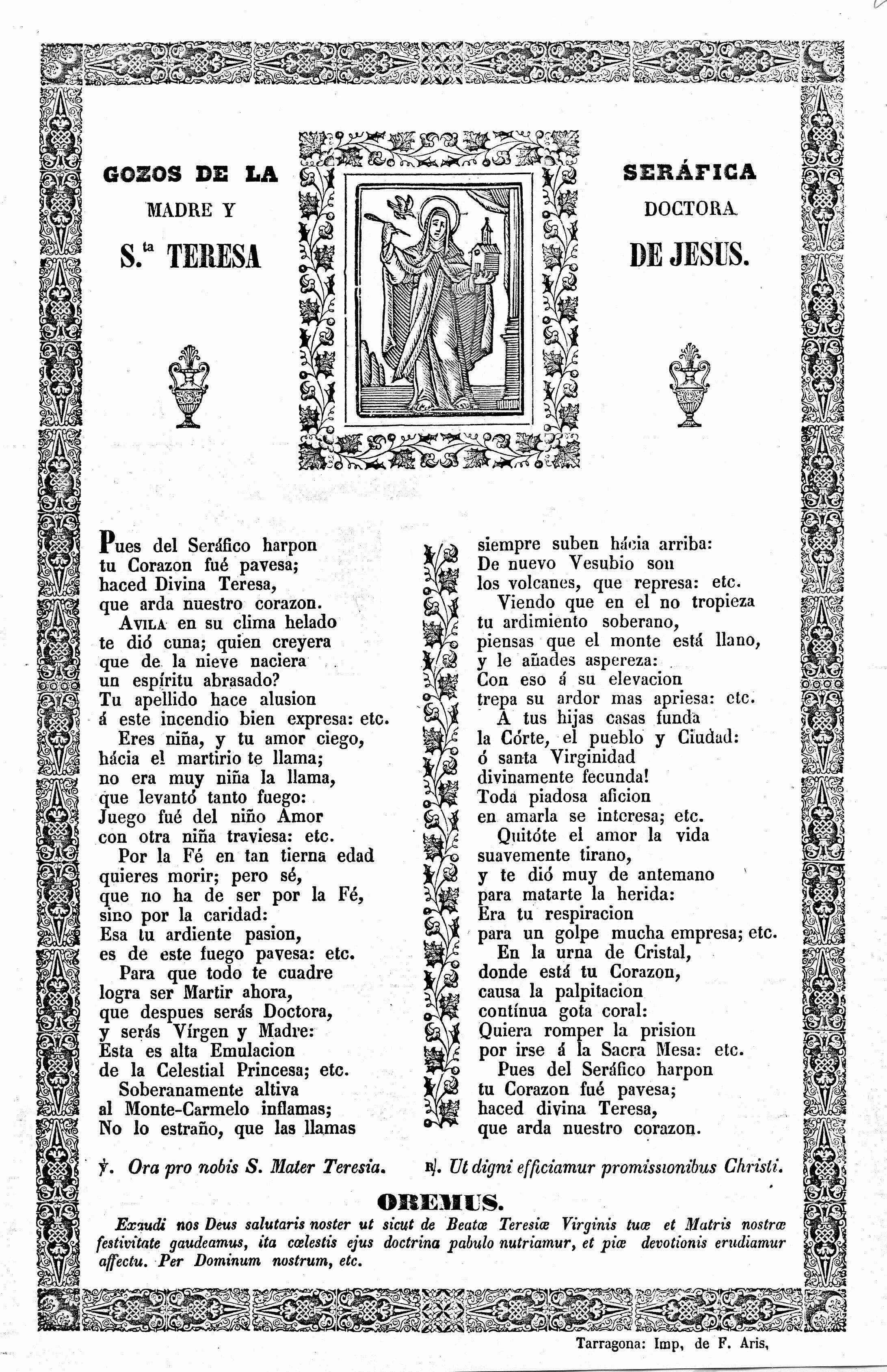 Gozos de la seráfica madre y doctora Sta. Teresa de Jesus, Tarragona: Imp. de F. Arís, s. a.