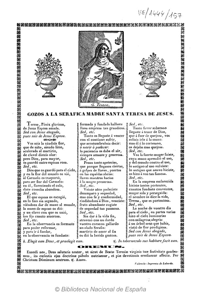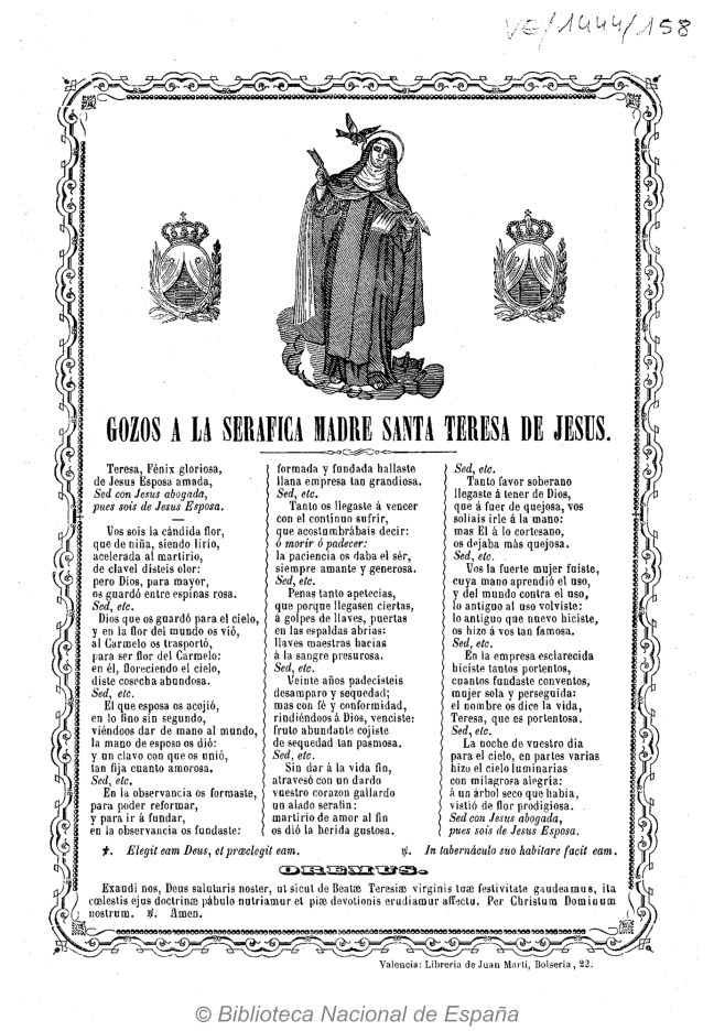 [1] Gozos a la seráfica madre Santa Teresa de Jesús, València: Imprenta de Laborda, s. a. ¶ [2] Gozos a la Seráfica Madre Santa Teresa de Jesús, València: Librería Villalba, Mercado, 61, s. a. ¶ [3] Gozos a la seráfica madre Santa Teresa de Jesús, València: Librería de Juan Martí, Bolsería, 22, s. a.