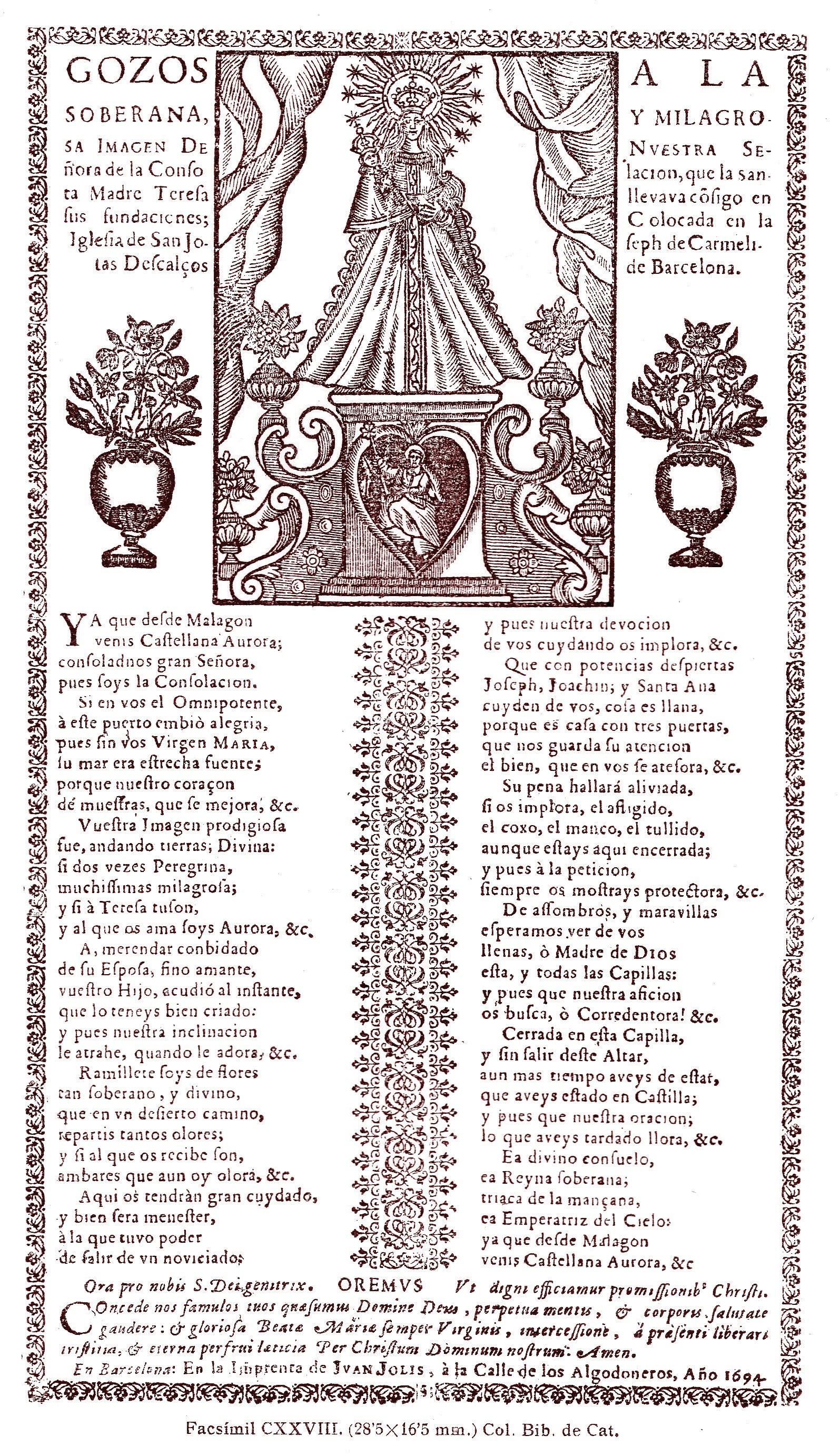 [1] Gozos a la Soberana, y Milagrosa Imagen De nuestra Señora de la Consolación, que la Santa Madre Teresa llevava consigo en sus fundaciones; Colocada en la Iglesia de San Joseph de Carmelitas Descalços de Barcelona, Barcelona: En la Imprenta de Juan Jolis, à la calle de los Algodoneros, Año 1694.