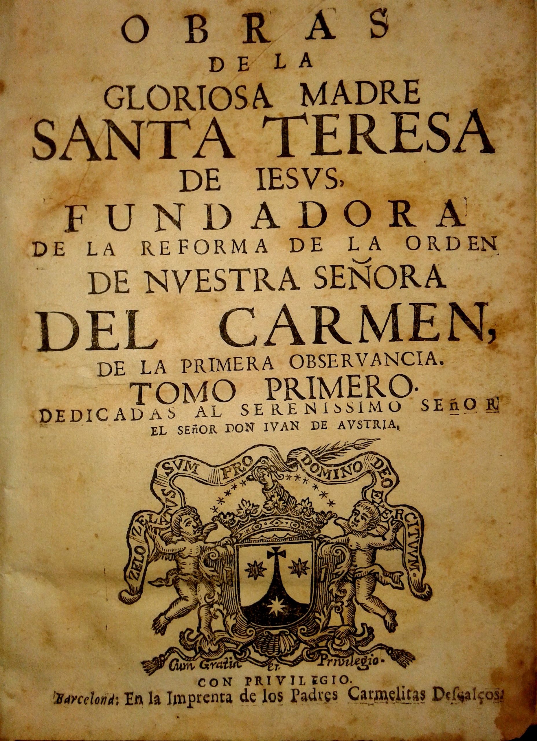 Obras de la gloriosa madre santa Teresa de Jesús, fundadora de la Reforma de la Orden de Nuestra Señora del Carmen, de la primera observancia. Tomo primero. Dedicadas al Sereníssimo Señor el Señor Don Juan de Austria. Con privilegio. Barcelona: En la Imprenta de los Padres Carmelitas Descalços [s. d.]