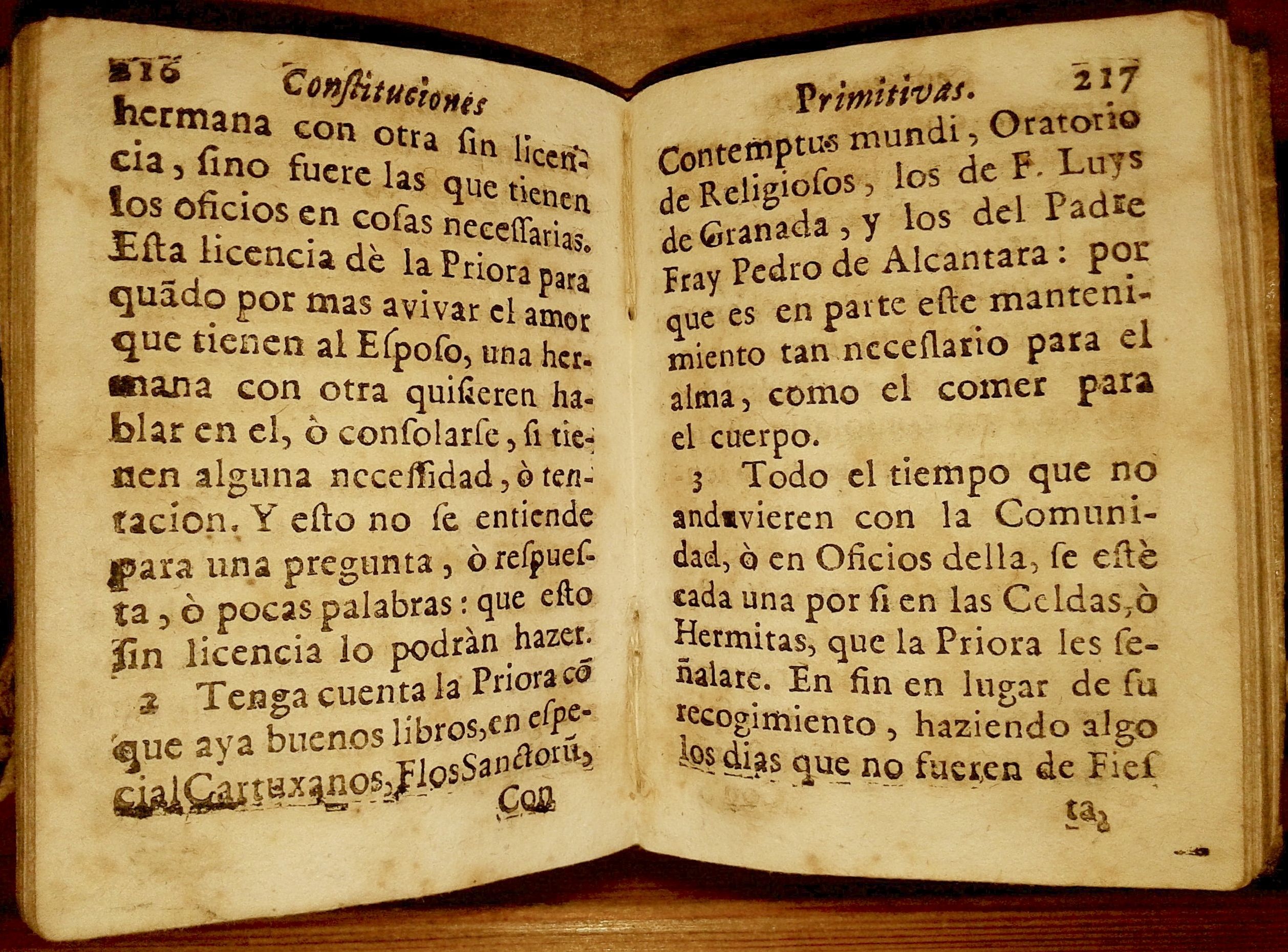 se lean libros espirituales y aprobados; y especialmente vidas de los santos padres y los martirios de los santos mártires y las vidas de otros santos, Dionisio Cartujano “De Quator novissimis”, Tomás de Kempis o Juan de Gersón “Del menosprecio del mundo”; o el “Flos Sanctorum” de Villegas, las Obras de fray Luis de Granada, conviene saber; el Memorial de la Oración; Guía de pecadores, las meditaciones de la Vida de Cristo, el Catecismo del Amor de Dios; las obras de fray Pedro de Alcántara, conviene saber; “De la Oración y meditación”; las obras de fray Diego de Estella “De la vanidad del mundo” y “Amor de Dios”, el “oratorio de Religiosos” de fr. Antonio de Guevara, Obispo de Mondoñedo; las Obras de Juan de Ávila, conviene a saber; el libro que se intitula “Audi Filia” y sus “Epístolas”; el libro de fray Luis de León intitulado “Nombres de Cristo”; y otros libros espirituales aprobados. (Constituciones, p. 176)