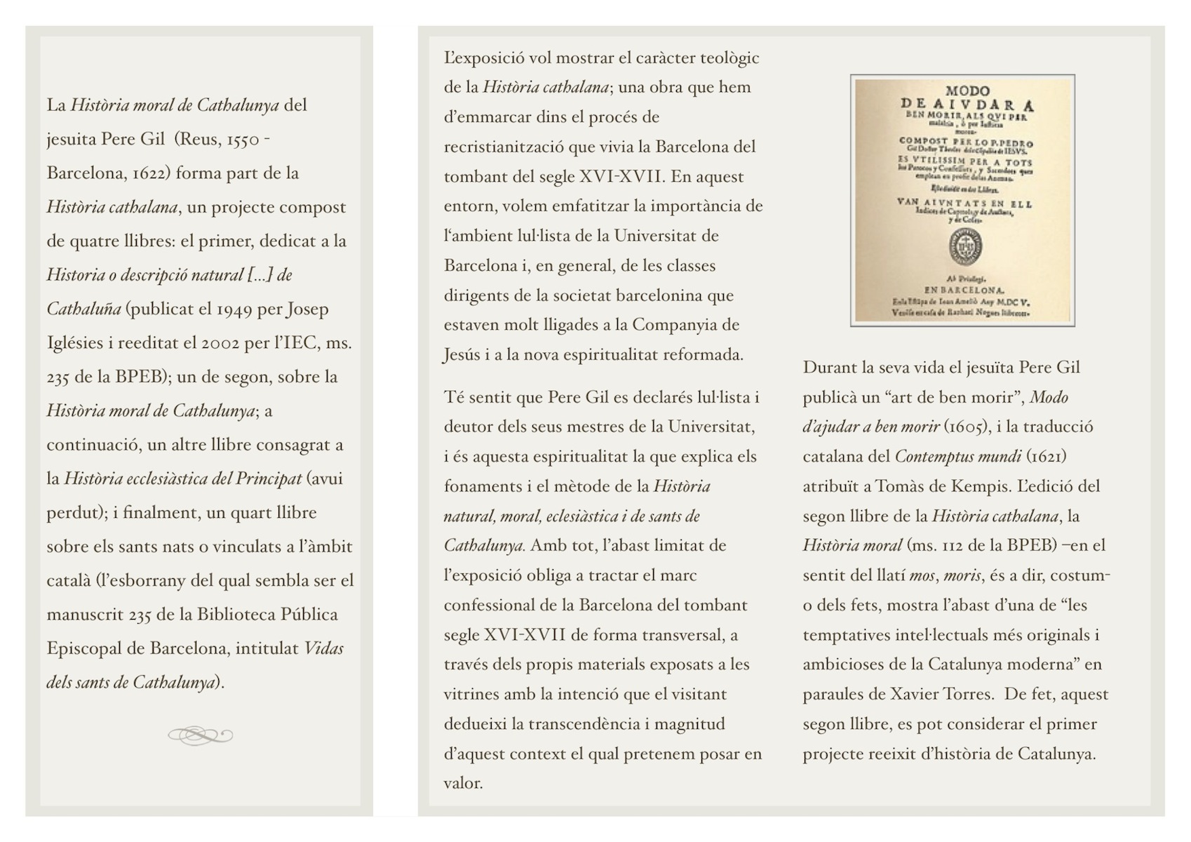 Té sentit que Pere Gil es declarés lul·lista i deutor dels seus mestres de la Universitat, i és aquesta espiritualitat la que explica les bases epistemològiques de la Història natural, moral, eclesiàstica i de sants de Cathalunya. Amb tot, l’abast limitat de l’exposició obliga a tractar el marc confessional de la Barcelona del tombant segle XVI-XVII de forma transversal, a través dels propis materials exposats a les vitrines amb la intenció que el visitant dedueixi la transcendència i magnitud d’aquest context el qual pretenem posar en valor.