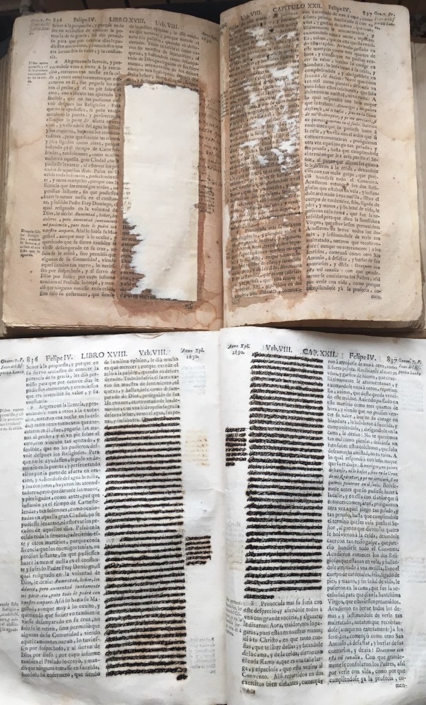Amb tot, potser l’aspecte que crida més l’atenció és la idèntica censura d’una part del text que trobem en ambdós exemplars, en les pàgines 836 i 837, referits a cert episodi biogràfic que experimentà a Barcelona, entre 1592-1594, Domingo de Jesús Maria, Ruzola López (Calataiud, 1559 – 1630, Viena), anomenat el taumaturg o el prodigioso. S’hi relata una aparició de la Verge Maria, que va adreçar unes paraules a Ruzola, seguida d’unes visions molt temptadores del maligne, en forma de dona, actes que apareixen descrits en el text censurat, però que, segons declara el cronista, “siendo indignos de que los refiera la Historia, es justo entregarlos al silencio”. I aquest silenci potser sigui el que van aplicar posteriorment els censors de l’obra.