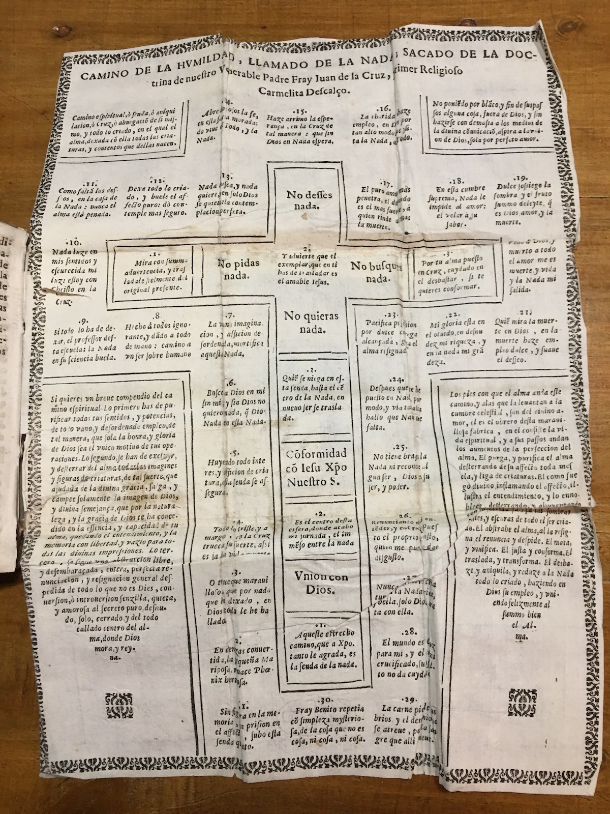 Resolt el misteri de l’estampa perduda, calia esbrinar d’on procedia aquest disseny, el seu origen. Cal recordar que, en el segon trienni de Jeroni de l’Assumpció com a definidor general, l’orde publicà, l’any 1618, la primera edició de les obres de sant Joan de la Creu, a Alcalà de Henares, a la impremta de la Viuda de Andrés Sánchez, i una segona edició, l’any 1619, a Barcelona, per l’impressor Sebastià Cormellas.[21] Les dues obres no són pas idèntiques: en l’edició d’Alcalá s’inclou, imprès en la pàgina 511, després de finalitzar la Noche oscura i abans de començar la Llama de amor viva, un inicial disseny del “Camino de la Humildad, llamado de la Nada […]”, amb els tercets santjoanistes, que en canvi no apareix en l’edició barcelonina de Cormellas, per alguna ignorada raó.