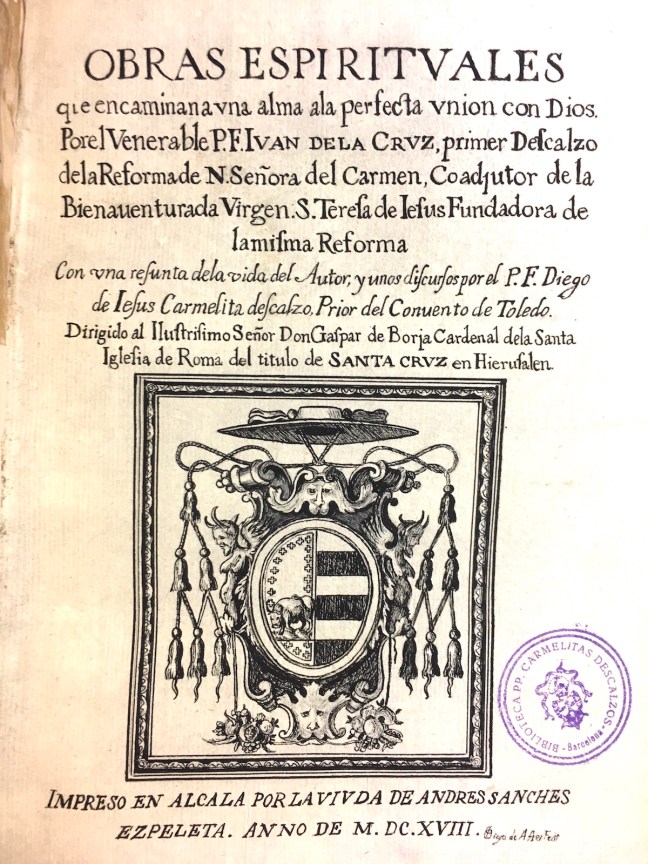 [21] Obras espirituales que encamina vna alma ala [sic] perfecta unión con Dios / por el Venerable P.F. Juan de la Cruz, primer Descalzo de la Reforma de N. Señora del Carmen […]; con una resunta de la vida del autor y unos discursos por el P.F. Diego de Jesús Carmelita Descalzo, prior del Conuento de Toledo […], En Barcelona: por Sebastián Cormellas, 1619.