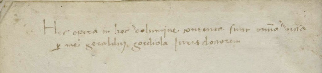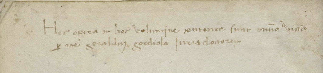 Destaquem que poc després de la seva confecció, situada pels investigadors a Itàlia, el manuscrit ja era en mans del jurista català Guerau Guardiola, que va afegir una nota de propietat al final del llibre: “Hec opera in hoc volumine contenta sunt omnia vissa per me, Gerald(u)m Gordiola, juris doctorem”, ‘Les obres que conté aquest volum han estat vistes per mi, Guerau Guardiola, doctor en dret’, on el participi “visa” recorda el “visum”, ‘vist’ de confirmació que acompanyava alguns documents oficials que calia referendar.