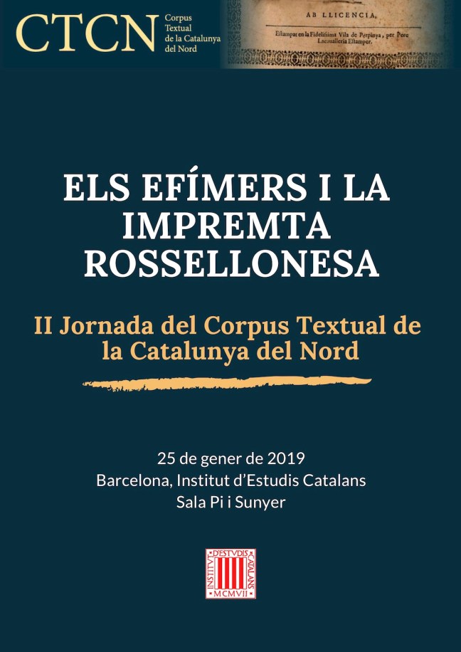 Comunicació de Mercè Gras (Arxiu dels Carmelites Descalços de Catalunya), "El certamen perpinyanès de 1614: un efímer teresià", dins la II Jornada del Corpus textual de la Catalunya del Nord. Data i lloc: 25 de gener de 2019, 12h 30'. Sala Pi i Sunyer de l’Institut d’Estudis Catalans, c/ Carme, 47, 08001 Barcelona. Organitza: Secció … Continua la lectura de Un efímer teresià perpinyanès a la II Jornada del Corpus Textual de la Catalunya Nord