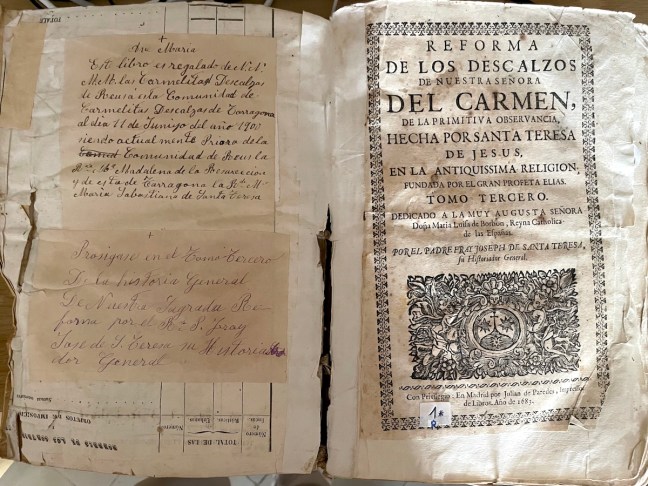 Este libro es regalado de NN. MM. las carmelitas descalzas de Reus a esta comunidad de carmelitas descalzas de Tarragona, el día 11 de junio del año 1900, siendo actualmente priora de la comunidad de Reus la Rda. M. Madalena de la Resurección, y de esta de Tarragona la Rda. M. Sabastiana de Santa Teresa.