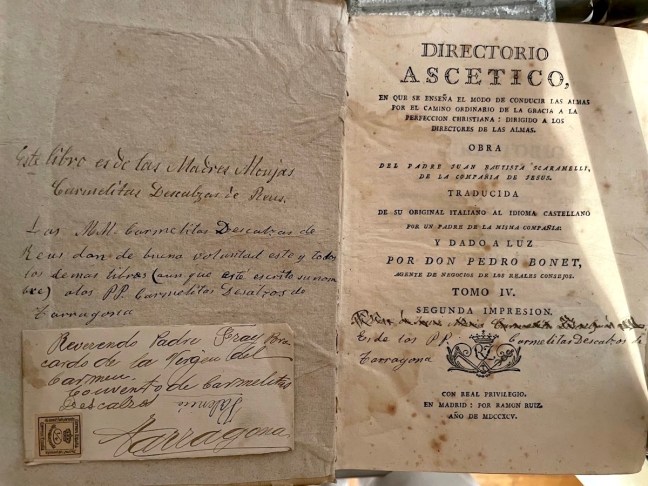 Este libro es de las madres monjas carmelitas descalzas de Reus. Las MM. carmelitas descalzas de Reus dan de buena voluntad este y todos los demás libros (aunque esté escrito su nombre) a los PP. carmelitas descalzos de Tarragona.