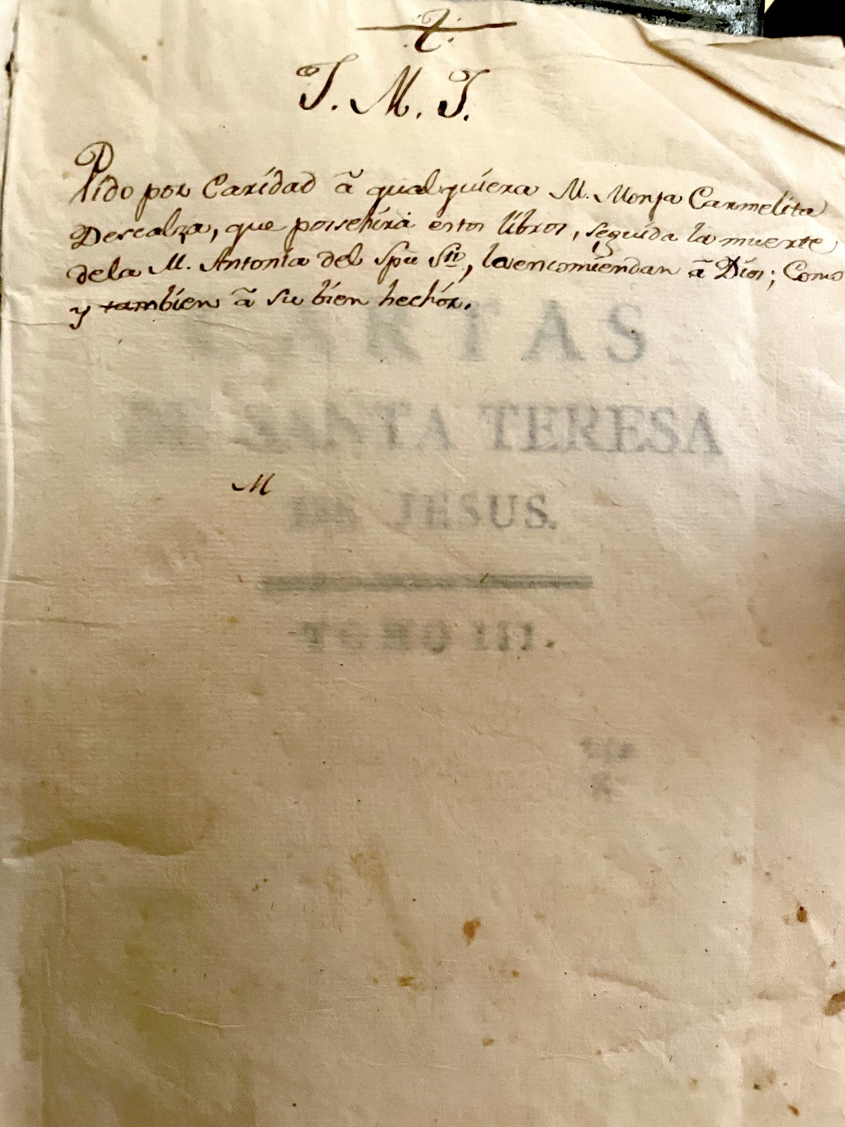 Pido por caridad a qualquiera M. monja carmelita descalça que possehirá estos libros, seguida la muerte de la M. Antonia del Spíritu Santo, la encomiendan a Dios, como y también a su bienhechor.