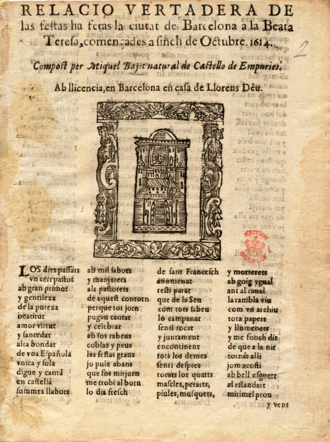 Alguns (desconeguts) autors d’opuscles poètics de tema teresià (III): Relacions catalanes de les festes de beatificació (Miquel Baget) Publicat el 17 Abril 2018 per Castell Interior Miquel Baget (o Bajet) és l’autor d’una altra de les relacions sobre la celebració de la beatificació de Teresa de Jesús a Barcelona l’any 1614: Relació vertadera de les festes fetes a la ciutat de Barcelona a la Beata Teresa, començades a sinch de octubre 1614, Llorenç Deu, 2 fulls, en quart. Únicament ha estat … Continua la lectura de Alguns (desconeguts) autors d’opuscles poètics de tema teresià (III): Relacions catalanes de les festes de beatificació (Miquel Baget)